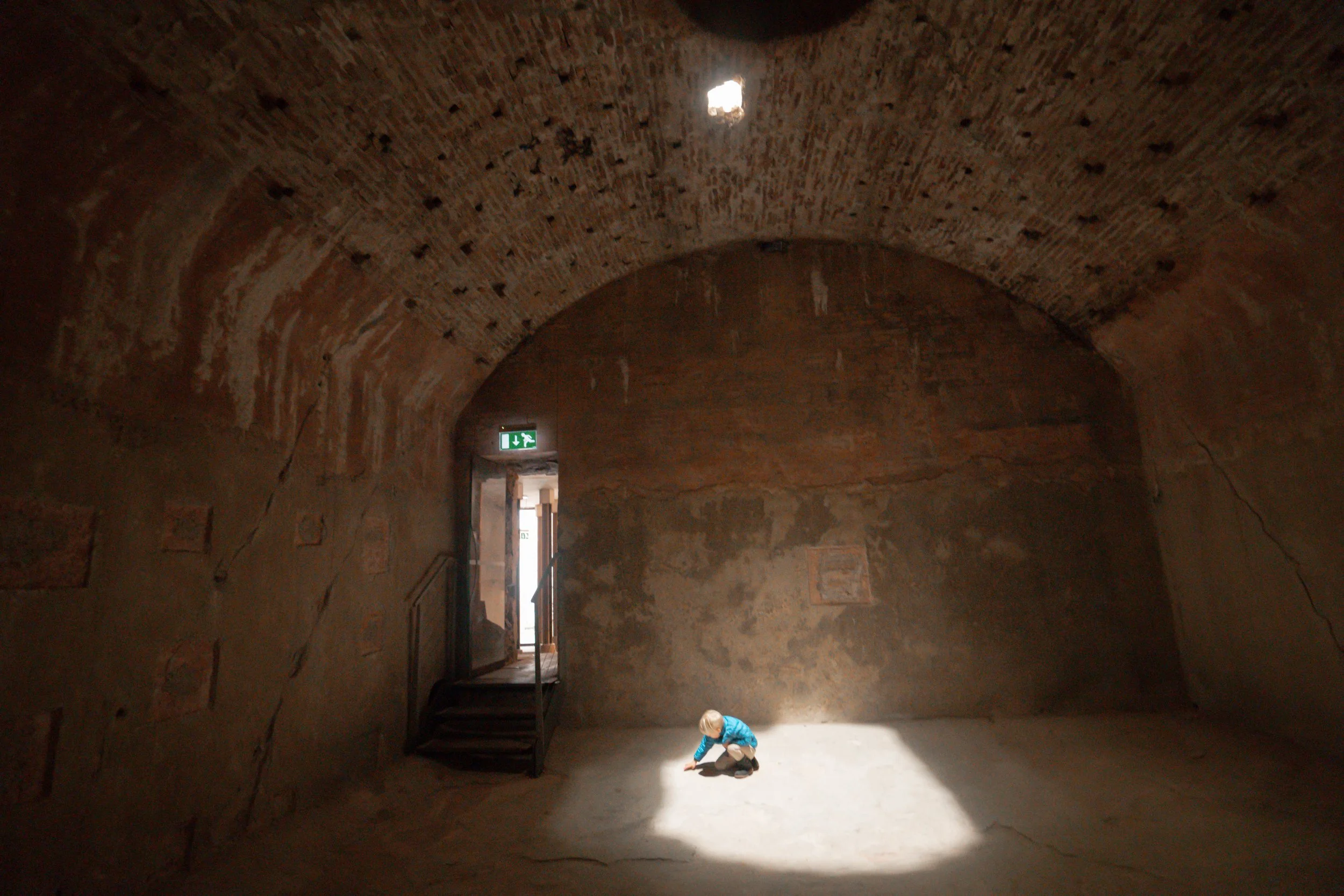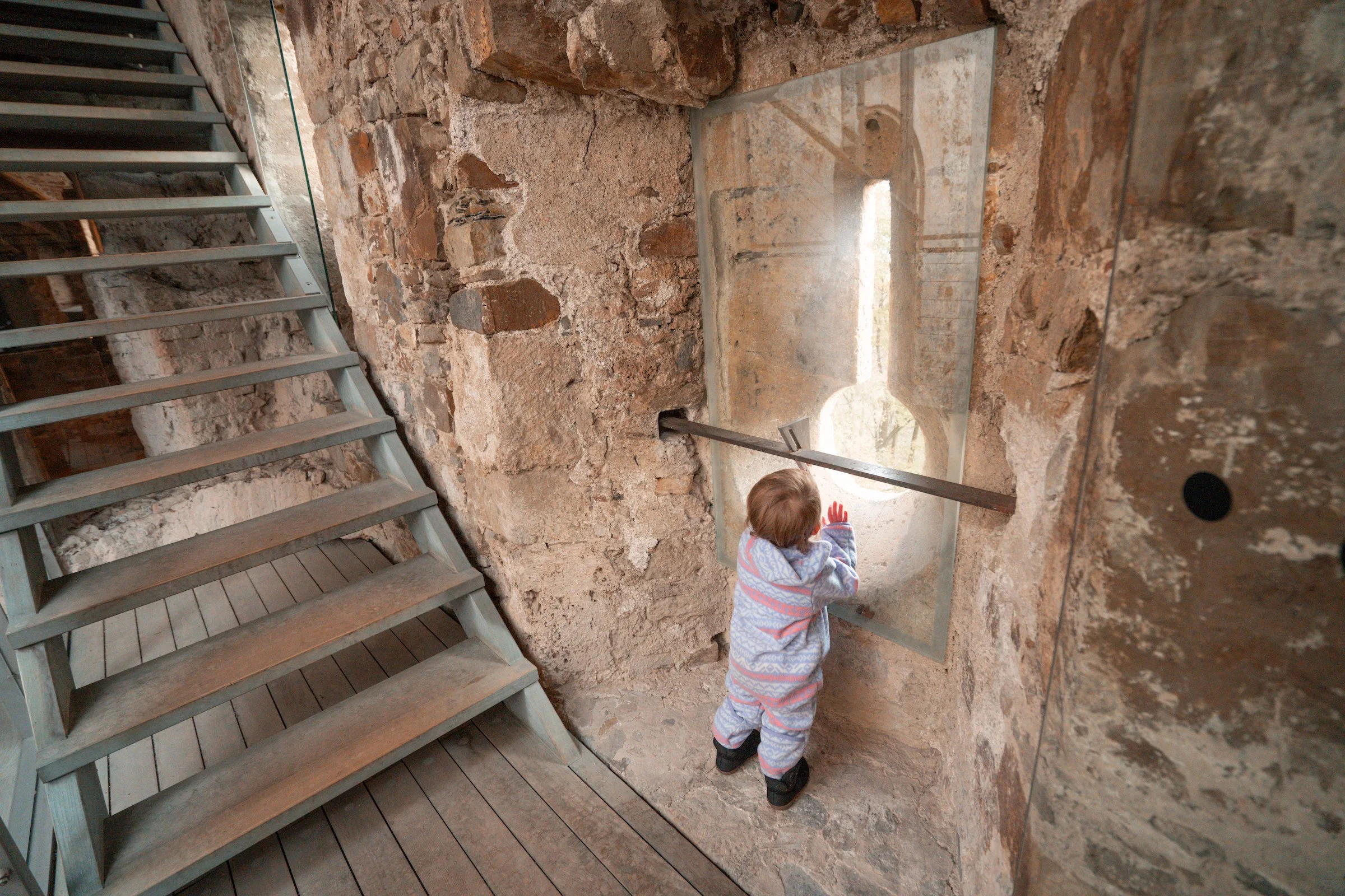After the bell tower, I took Jasper to follow a sign that said “Dragon’s Den” that led us to a really cool arched door with a circular window above it with a plaque that indicated it was the dragon’s den, but unfortunately it was roped off. However, we saw a passageway to the right that led us down to the basement level of the castle where we got to use the bathroom, see the escape well, and explore the cistern. It was really cool and definitely Jasper’s favorite part of the castle. The cistern was actually a room with a sloping floor and was almost pitch black with a square of brilliant light on the floor from a strategically placed hole in the ceiling. It was super interesting and Jasper loved walking around in the dark. There was also a circular room nearby with a flight of narrow stairs up to a window where you could look into another room. It really was a toddler’s dream to explore all these random rooms, stairs, levels, and passageways. They’ve done a really good job throughout the castle of mixing ancient architecture with modern touches like glass panels and interesting lighting and this was especially evident in the basement, which made it extra fun for me to explore as well.
