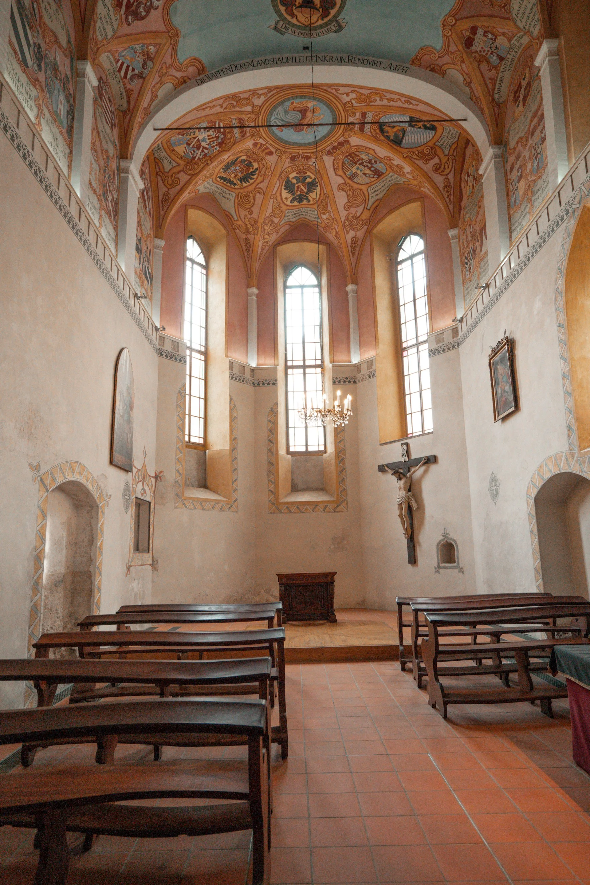 After the Museum of Puppetry we headed to the courtyard where Jasper immediately found a metal miniature model of the castle. He was absolutely fascinated by it and had the best time imagining his toy car lived there. While he was distracted playing around the castle model and Freya was burning off energy running around the courtyard, I headed to the “Viewing Tower” - the bell/clock tower that you can climb to the top of with a ticket to take if the views. The Chapel of St. George, dedicated in 1489, is right beside the bell tower, so I stopped there first. It was small but definitely worth checking out with beautiful paintings on the ceiling and a lovely chandelier hanging in the middle of the room. After the chapel I followed signs to the tower where I had to scan my ticket to open some gates and started my climb. I reached a room first with the bells, great views out the windows, and some ancient books in display cases linked to the history of the castle. Then started the climb up a really cool spiral staircase to the top of the tower. It was a decent climb but it’s not a super tall tower so a toddler could definitely do it or be carried. The views from the top over the city were lovely, but you get similar views from other freely accessible parts of the castle since it’s perched on a hill. The real benefit of the view from the top of the tower was looking down on the castle courtyard, which was pretty cool. It was also fun climbing the spiral staircase and made for some really interesting pictures.