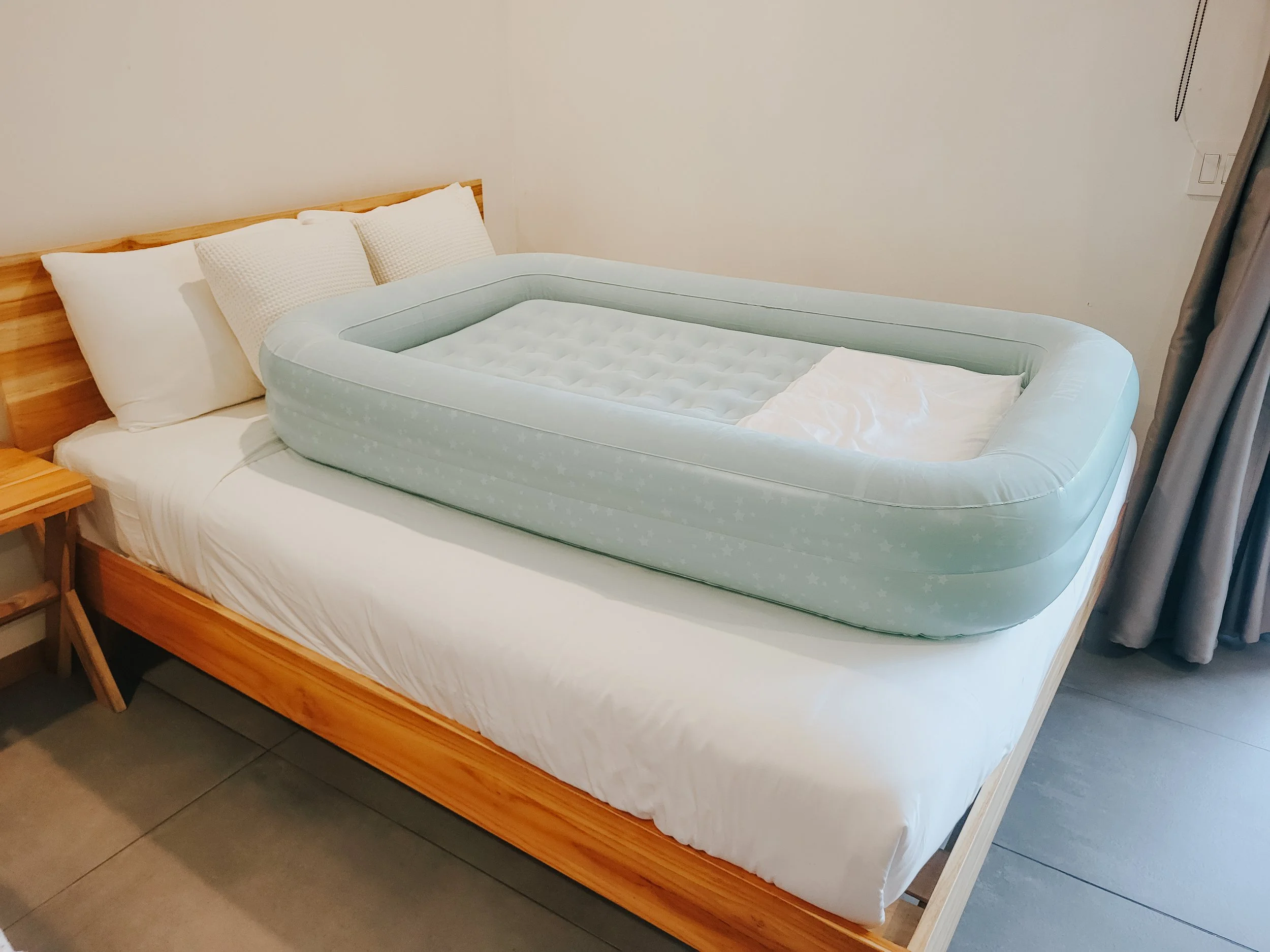 Last month we traveled to the little town of Santa Teresa, Costa Rica, for a week with our toddler and 4-year-old. Airbnbs in the area were pretty expensive, so we decided to stay in a hotel room at Ventura Santa Teresa that had a kitchenette and two double beds. It was a fairly family friendly place to stay, but unfortunately they didn’t offer any kind of infant crib or pack n’ play that we could use for our toddler. We considered putting the toddler and 4-year-old together in one of the double beds, but knew it would be too difficult for them to fall asleep together. We always travel very light so there was no way we were going to be bringing our own pack n’ play with us, so I decided to look up baby equipment rentals in Santa Teresa, but was doubtful we’d find anything since it’s a pretty small place. As such, I was pleasantly surprised to discover Santa Baby Rentals in Santa Teresa! They had a five star Google rating from 22 reviewers and a decent website with an impressive selection of equipment for babies and toddlers (strollers, high chairs, car seats, safety gates, baby monitors etc) and a crib, pack n’ play, and inflatable toddler bed for sleeping options. As such, we decided to rent an inflatable toddler bed since it was the cheapest option and wanted to share our experience for anyone else looking to rent baby/toddler equipment in Santa Teresa!