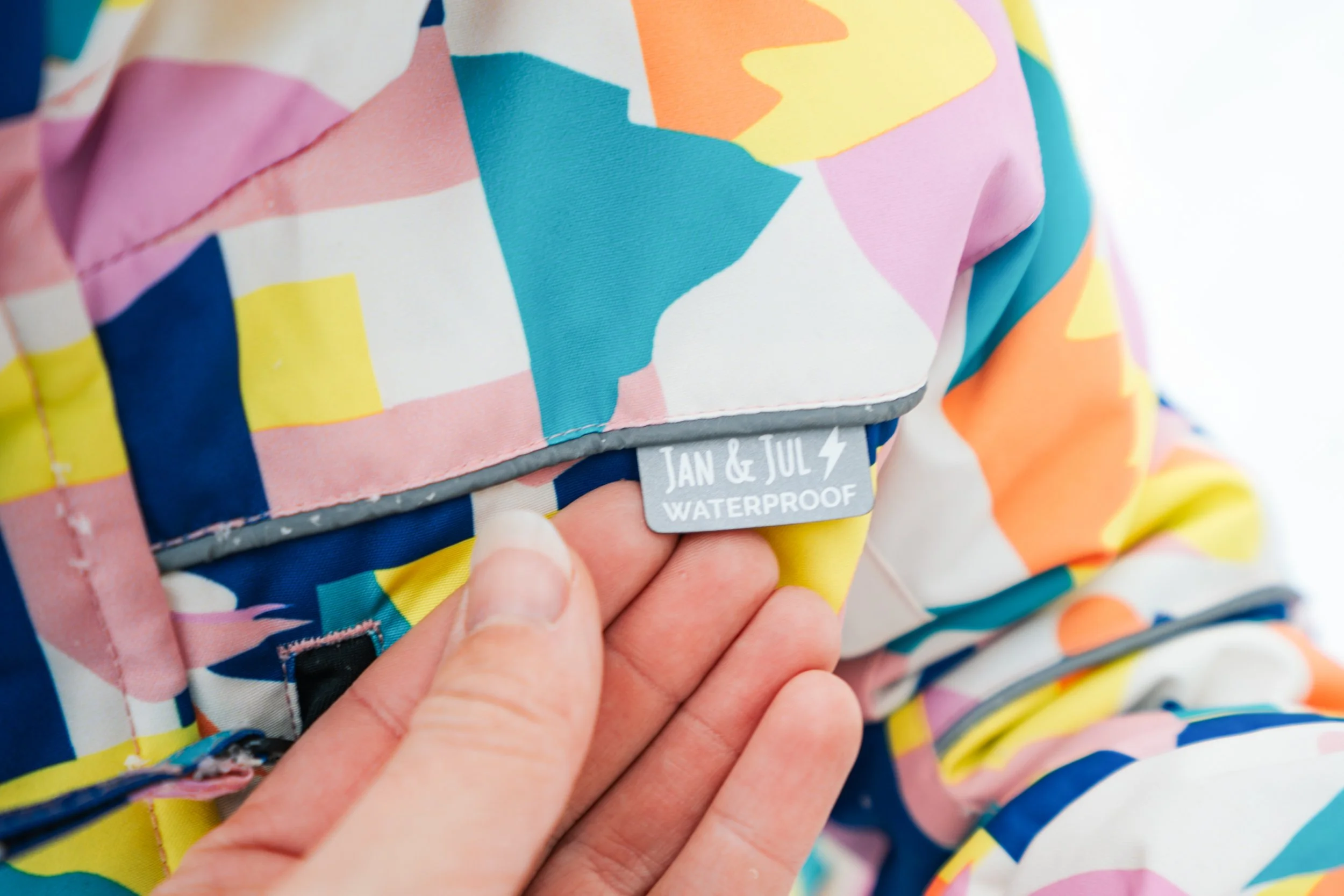 Let’s start with the snowsuits! We got Jan & Jul’s waterproof snowsuits for each of our children, ages 2 and 4 in sizes 3T and 4T as our 2-year-old is technically 2.5-years-old and in the 90th percentile for height. Jan & Jul’s site indicates that a 3T fits children ages 3-4 and a 4T fits children ages 4-5 as they are generously sized to allow layering. That is definitely true as both snowsuits are pretty large on our kids and will be easily wearable for the next couple of years size wise. As such, my recommendation would be to not size up. When the snowsuits arrived, they looked and felt like good quality products and we love the cheery colors and patterns, which make it easy to spot your kiddo. Other features we really like are:
