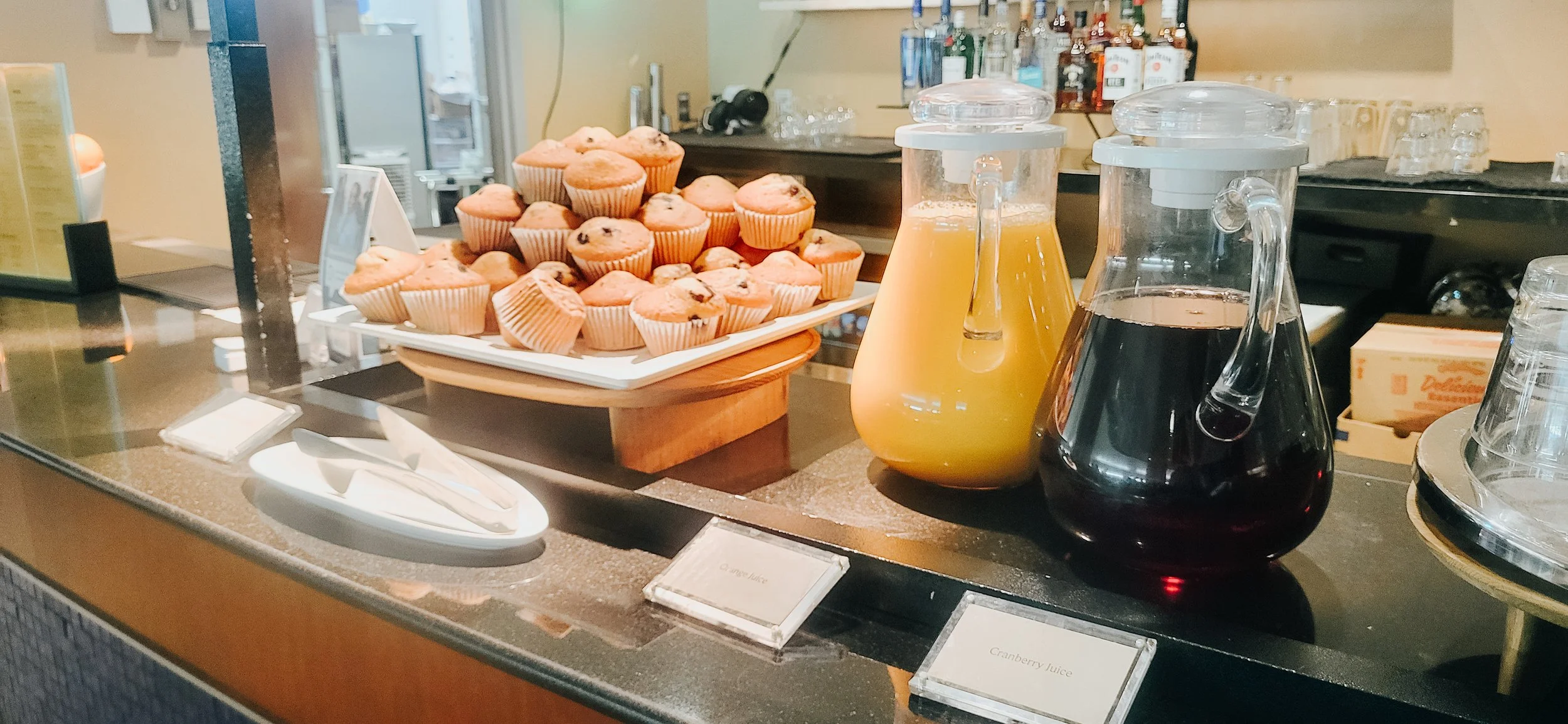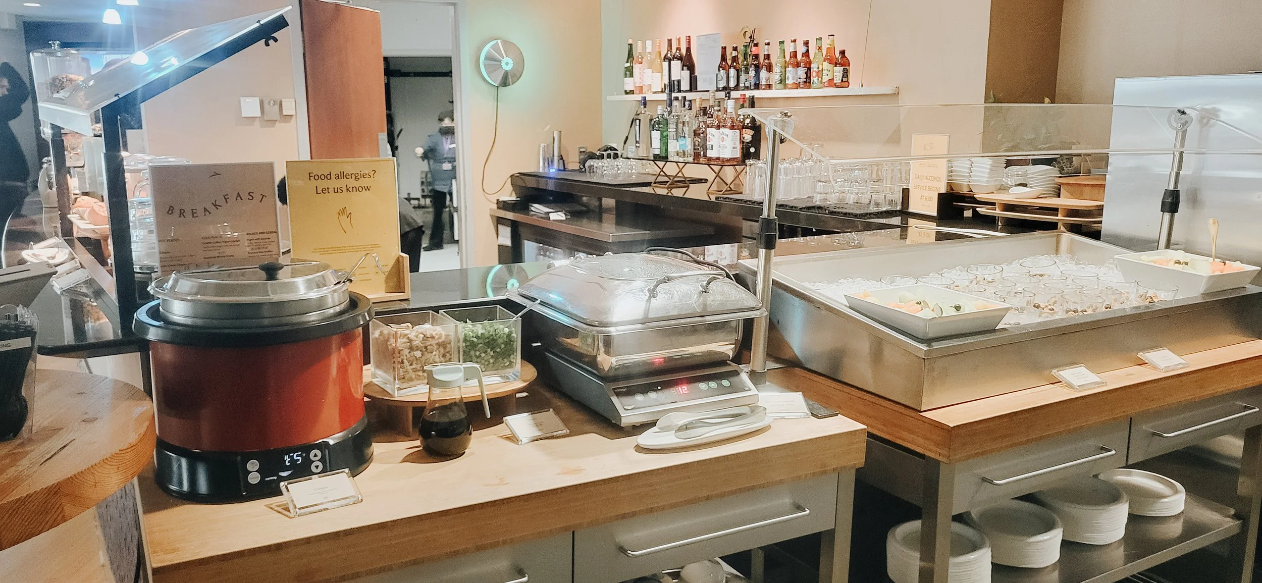 This is the first The Club at SEA lounge we visited located in Concourse A across from gate A11. Our first impression of this lounge was that it was a little shabby and dark without any tables or work areas to speak of, but the food selection was decent. We also appreciated the large freely accessible drinks fridge. We arrived at breakfast time and had some decent omelettes, muffins, hot chocolate for Justin, and a pretty good coffee for me. Other items on offer were bagels with lots of spreads, yogurt parfaits, and congee. I went to check out the bathroom and while it was clean and modern, there was no shower. Overall thoughts: