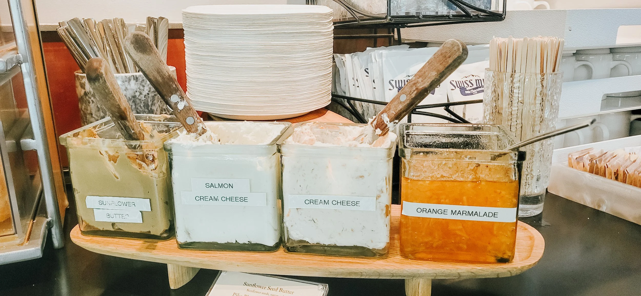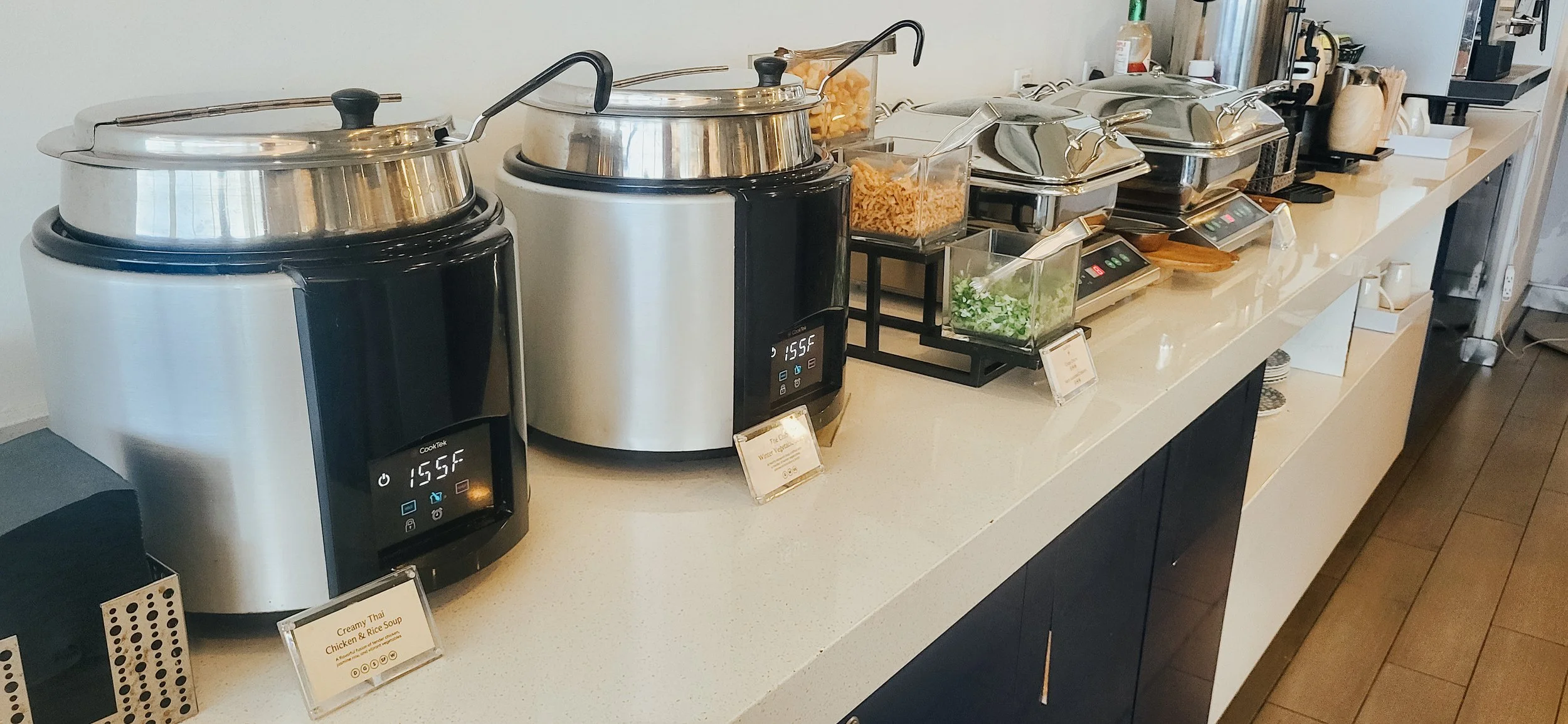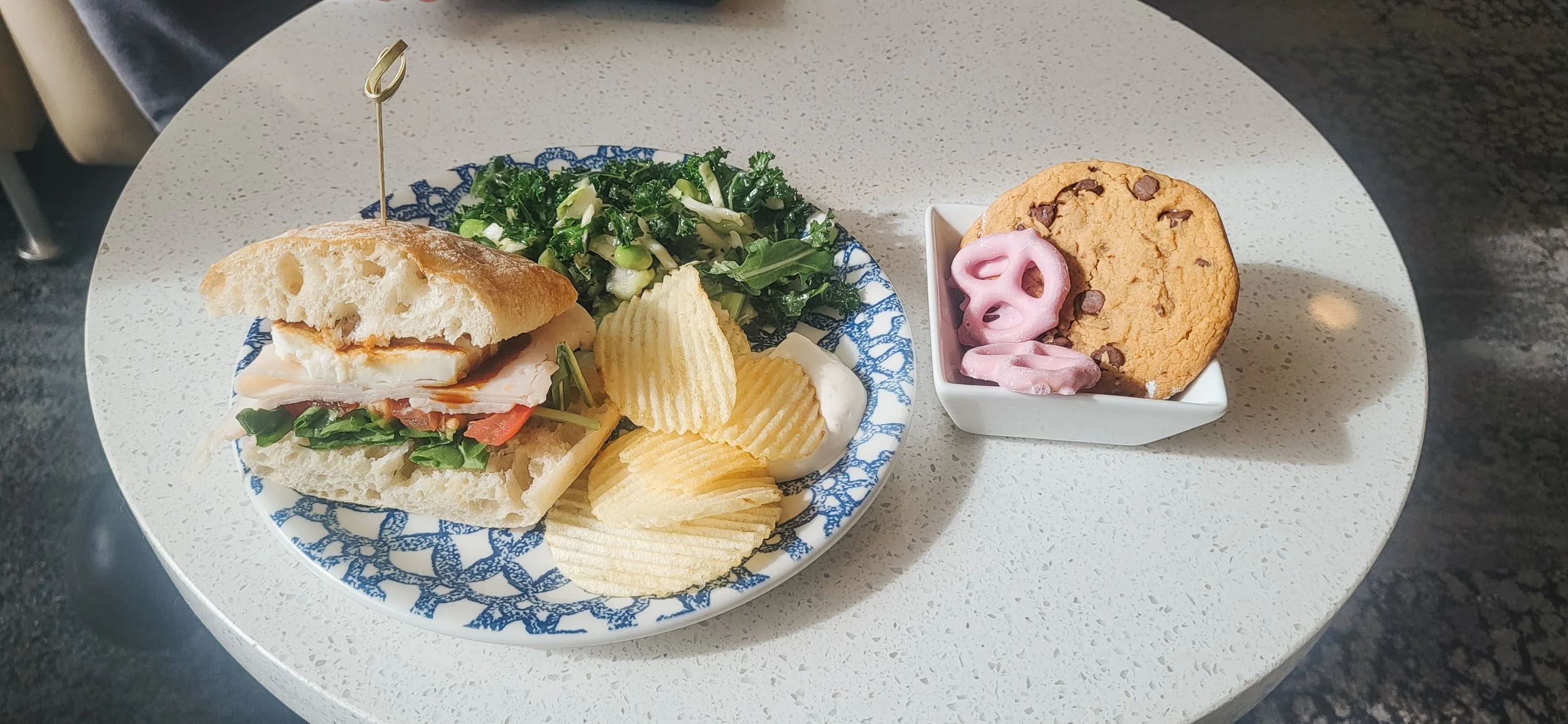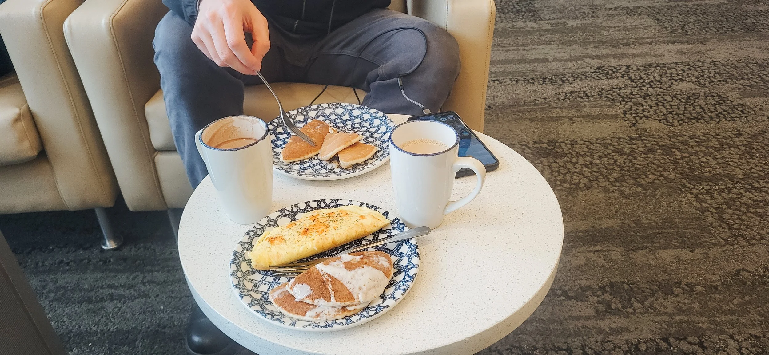 When we finished at The Club lounge in Concourse A, we headed to The Club lounge in Concourse S. Even though it’s in a different terminal, it’s all airside so you don’t have to clear security again and it was an easy train ride between terminals. Our first thoughts upon entering the second The Club lounge was that it was definitely more spacious and looked fresher and fancier compared to the other lounge. We especially appreciated the many work desks and big table and also noted a nice long padded bench where someone was catching a nap. There was also a lot more natural light so better if you need to, say, jump on a video call for work. Since both lounges are by The Club, the food was almost identical, but with the addition of cinnamon pancakes. We were, however, sad to discover that they didn’t have a drinks fridge and their fancy coffee machine was out of service. They did have coffee in a warming pot though with various milks and it was decent. We checked out the bathrooms and they did have showers, but they were locked without any signage and out of service in the men’s bathroom per Justin. I did read on the lounge’s website though that the showers are apparently complimentary, so you must just have to check in at the front desk to have staff open them for you. Right as we were about to leave the lounge they switched from their breakfast service to their lunch service, so we were lucky enough to sample that as well. Lunch had multiple entrees like curry, fried rice, a couple soup options, sandwiches, salad, chips, cookies etc. We especially liked that there were multiple vegetarian entree options and thought the food was pretty tasty. Overall thoughts: